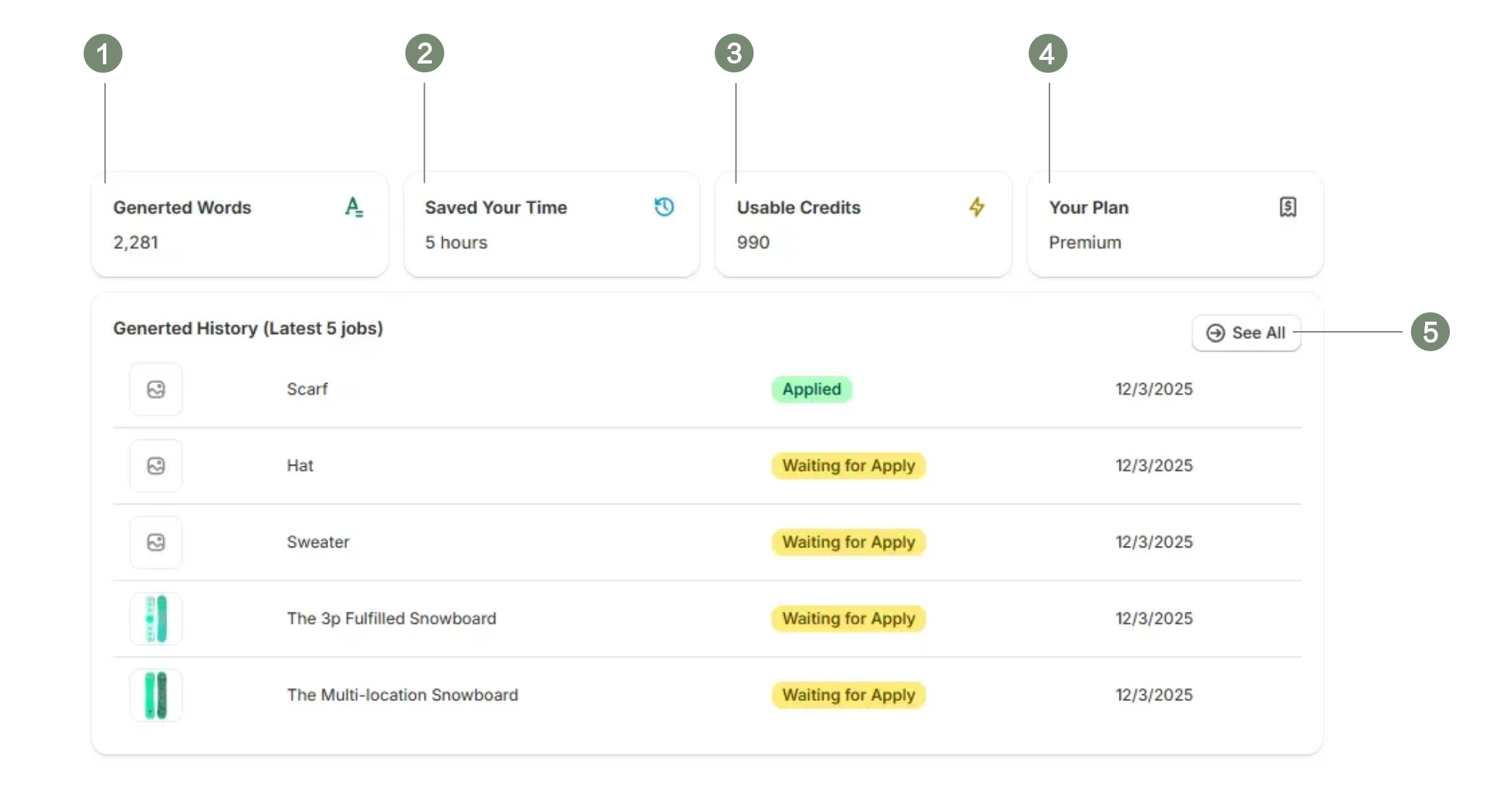 A quick view of your latest 5 generation tasks to track immediate progress. Click here to navigate to the generation history